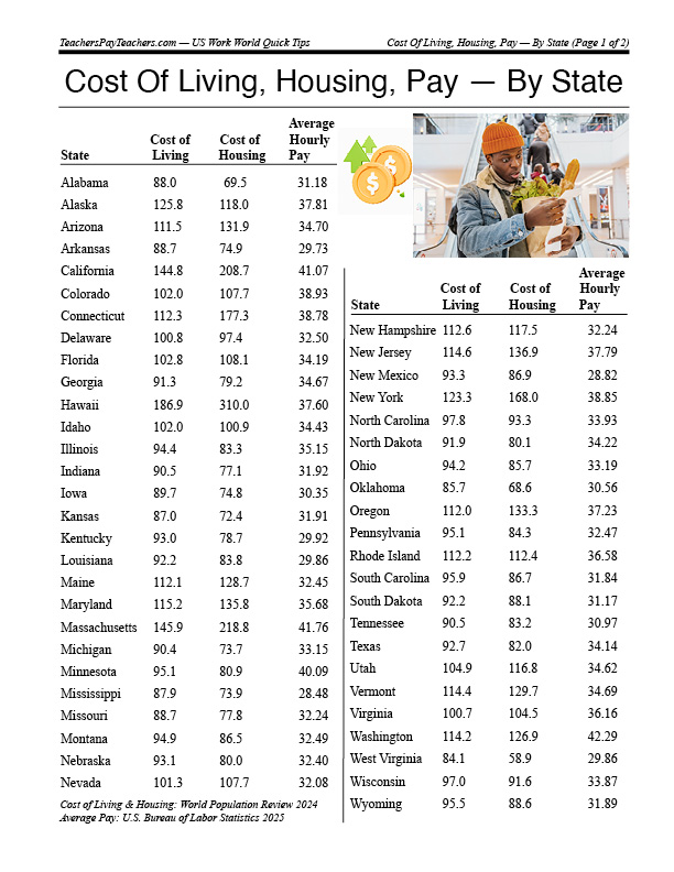 Cost Of Living, Housing, Pay — By State — PLUS Map Activity